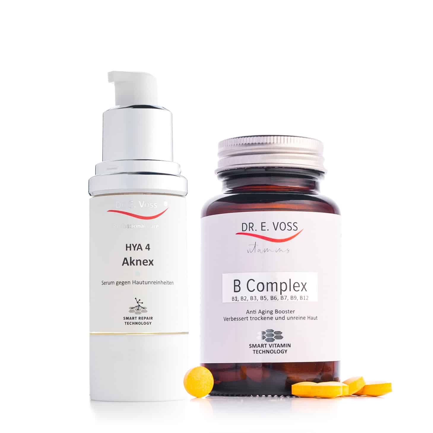Set includes: 90 Vitamin B Complex (3-month supply), 30ml HYA 4 AKNEX Serum